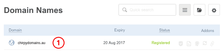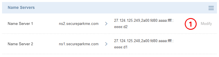 (1) Under the Nameservers box, mouse over to the right side of the nameservers and click the Modify link.