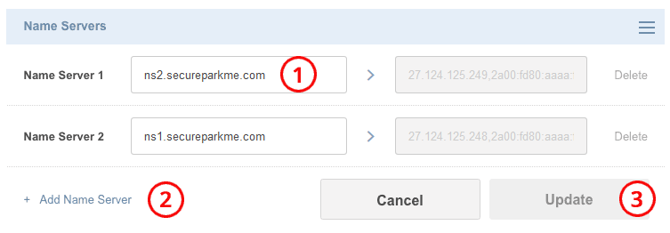 You can change the nameservers of your Domain to point to another web/email hosting provider. Our default nameservers are ns1.secureparkme.com and ns2.secureparkme.com.