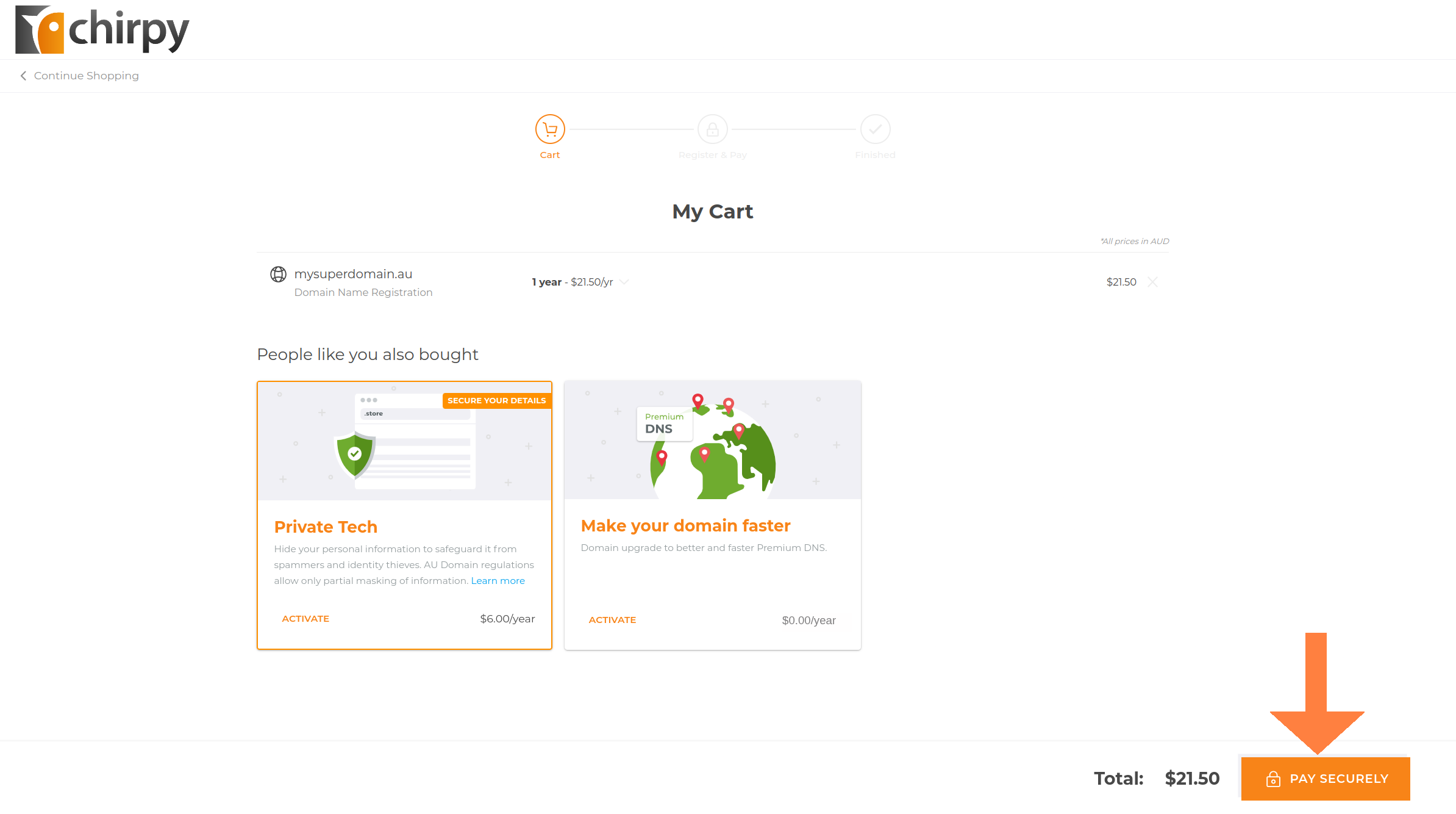 After your Domain is added you'll see your shopping cart. If you want more domains, click Continue Shopping.